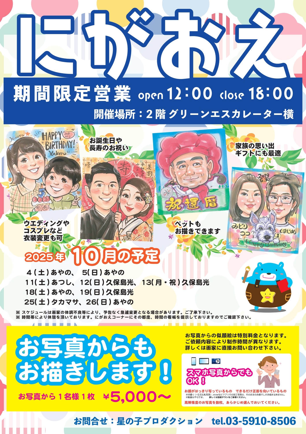 ※スケジュールは画家の体調不良により、予告なく急遽変更となる場合があります。ご了承下さい。 ※時間帯により休憩を頂いております。にがおえコーナーにその都度、時間の看板を提示しておりますのでご確認ください。