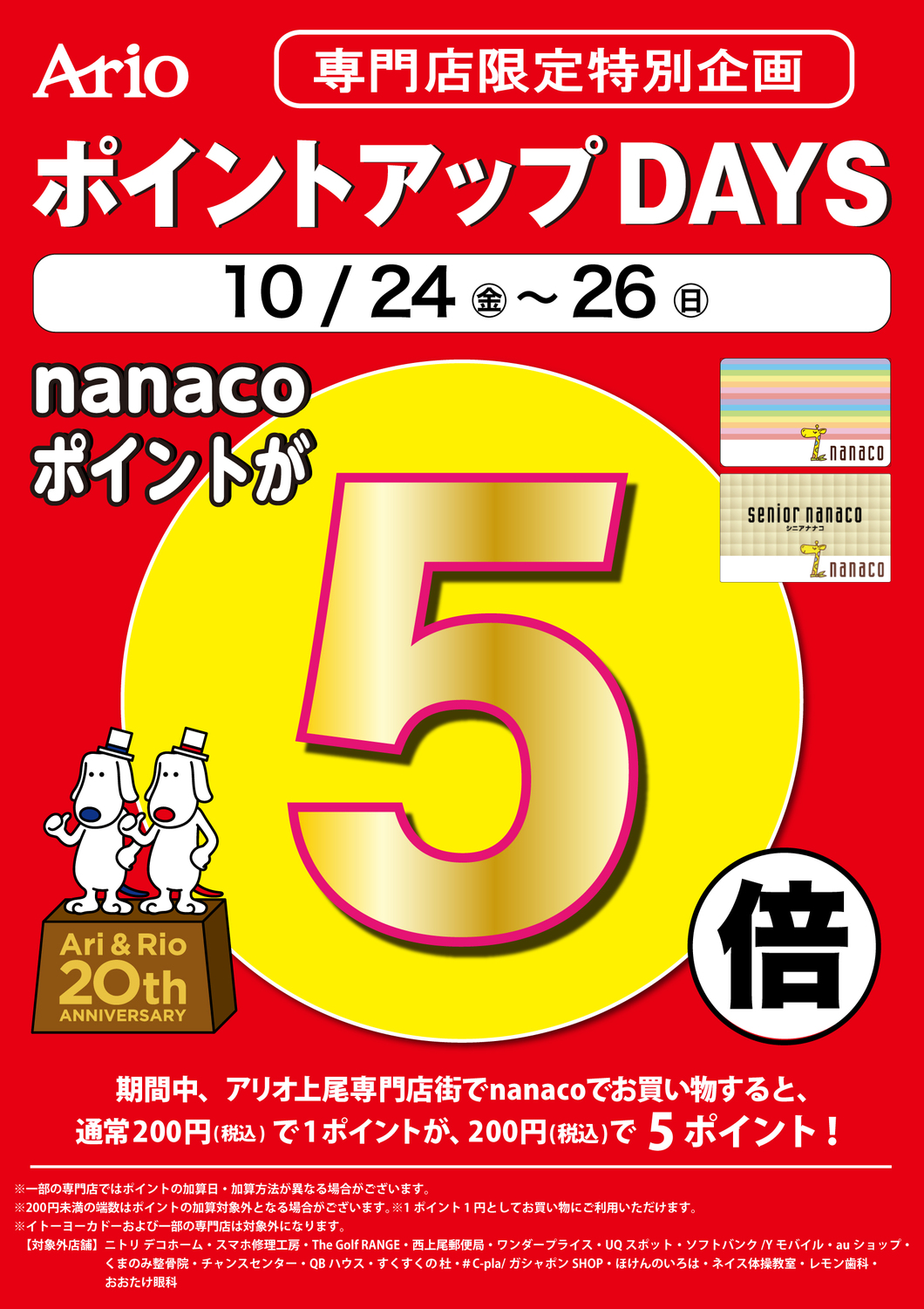 期間中、アリオ上尾専門店街でnanacoでお買物すると、通常200円(税込)で1ポイントが、