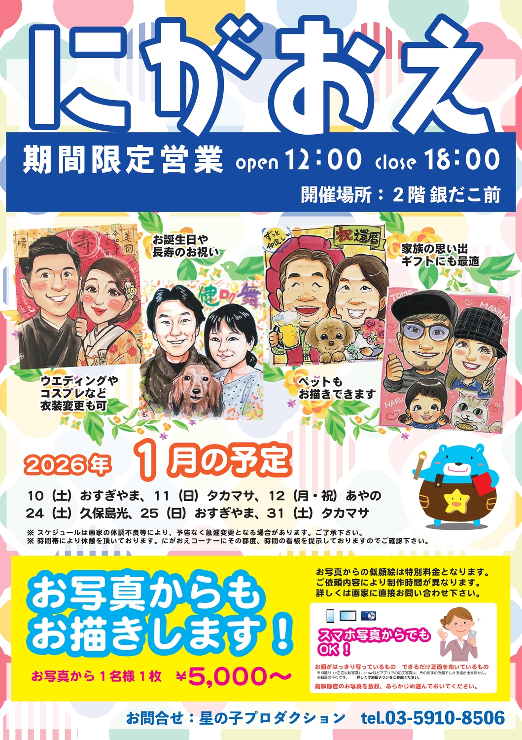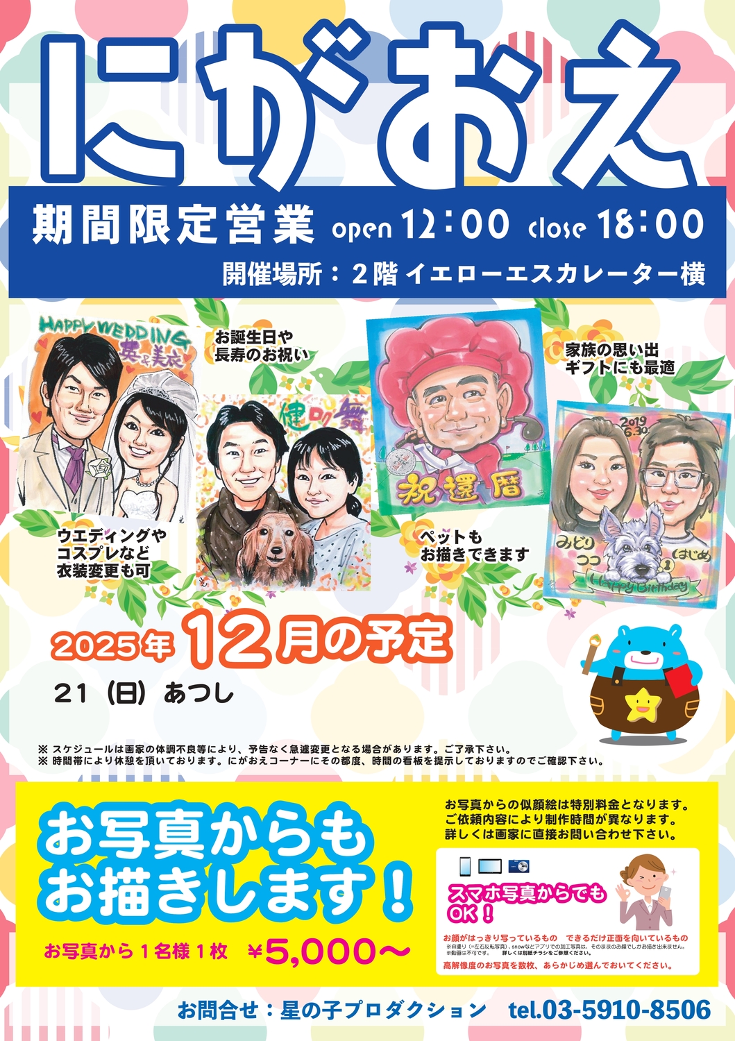 ※スケジュールは画家の体調不良により、予告なく急遽変更となる場合がございます。ご了承下さい。 ※時間帯により休憩を頂いております。にがおえコーナーにその都度、時間の看板を掲示しておりますのでご確認ください。