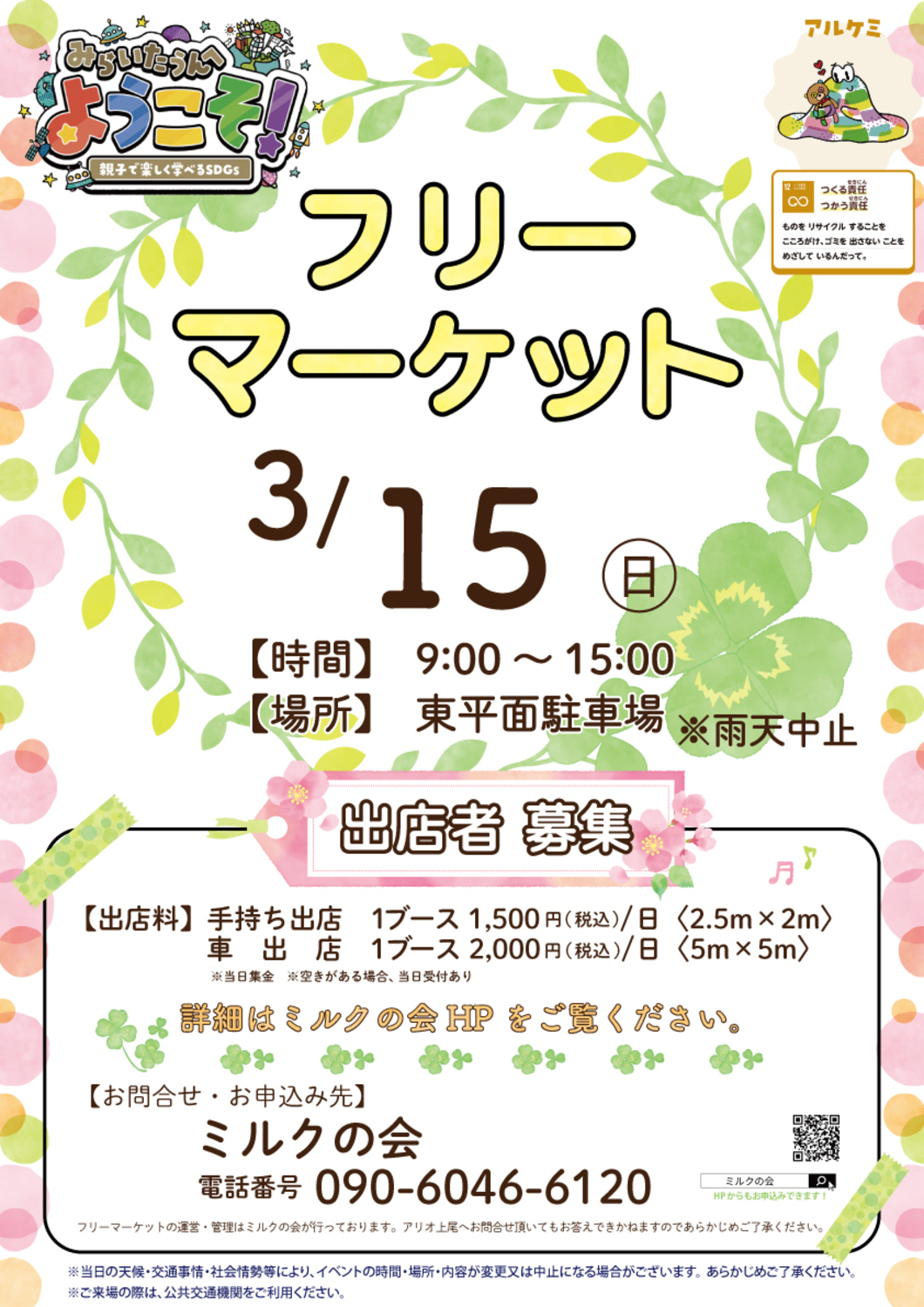 ・フリーマーケットに関するお問い合わせは、ミルクの会/TEL:090-6046-6120 までお問い合わせください。