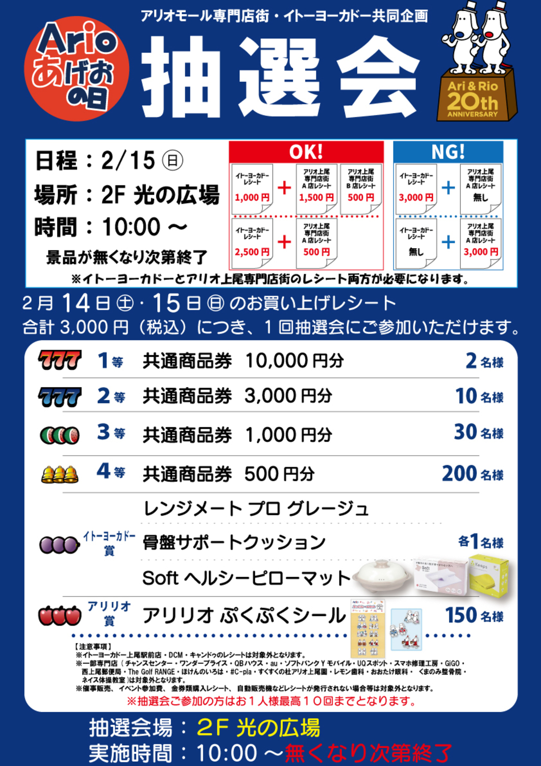 アリオモール専門店街・イトーヨーカドー両方の2/14(土)・2/15(日)のお買い上げレシート合計3,000円(税込)につき1回抽選会にご参加頂けます。
