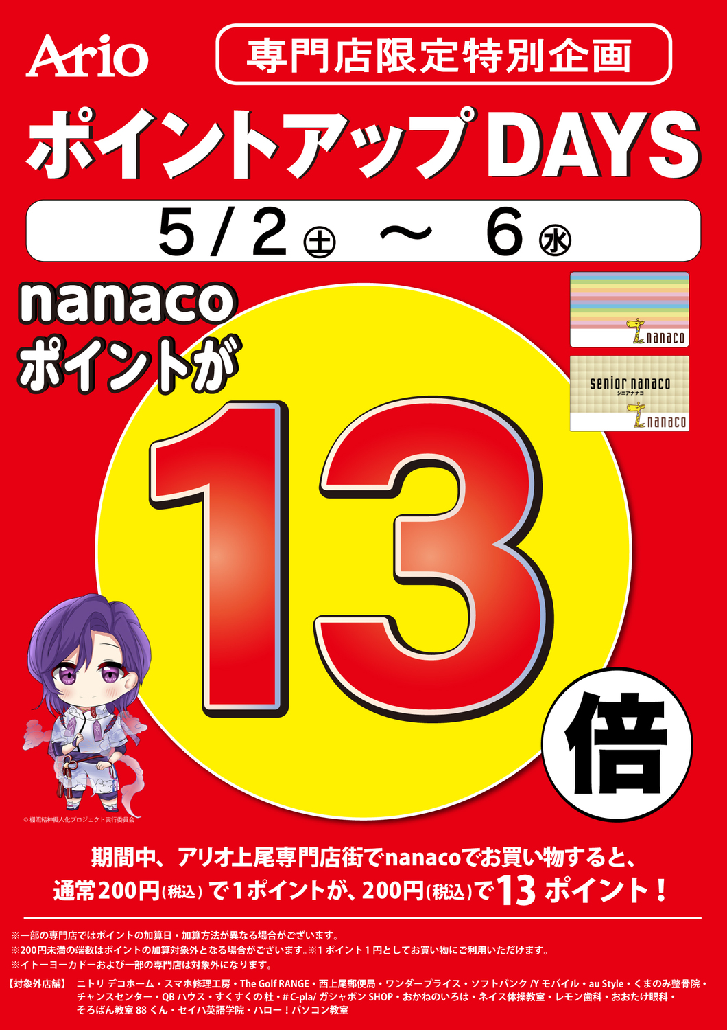 期間中、アリオ上尾専門店街でnanacoでお買物すると、通常200円(税込)で1ポイントが、