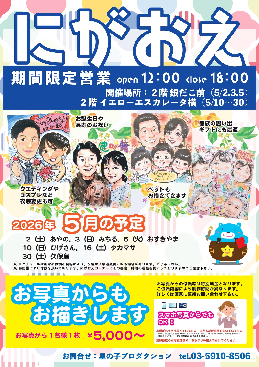 ※スケジュールは画家の体調不良により、予告なく急遽変更となる場合がございます。ご了承下さい。 ※時間帯により休憩を頂いております。にがおえコーナーにその都度、時間の看板を掲示しておりますのでご確認ください。