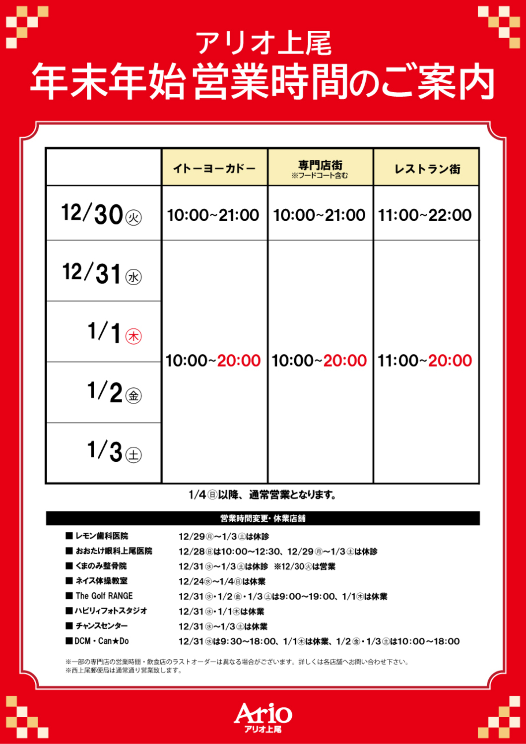※一部の専門店の営業時間・飲食店のラストオーダーは異なる場合がございます。詳しくは各店舗へお問い合わせ下さい。