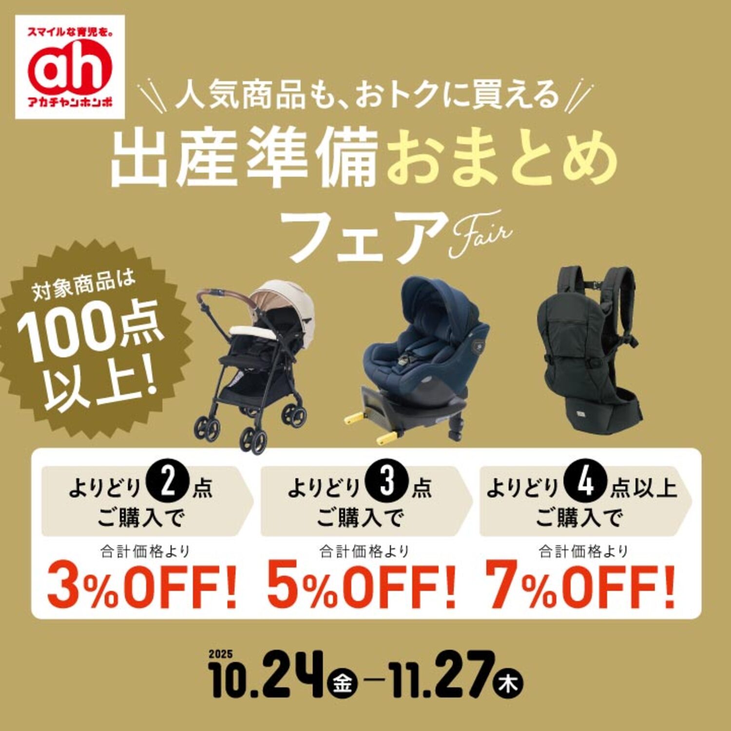 10/24(金)~11/27(木)の期間はおまとめ買いのチャンス! ベビーカー、チャイルドシート、抱っこ紐、ベビーラックなどの対象商品を よりどりでご購入いただくと、最大7%OFF◎ コンビのチャイルドシート「エッグショック ロッタZG」や、エルゴの「ベビーキャリア オムニデラックス」など、一部商品にはアカチャンホンポポイントのプレゼントも! この他にも人気の抱っこ紐やラック、おふとんセットなど多数取扱い中です♪