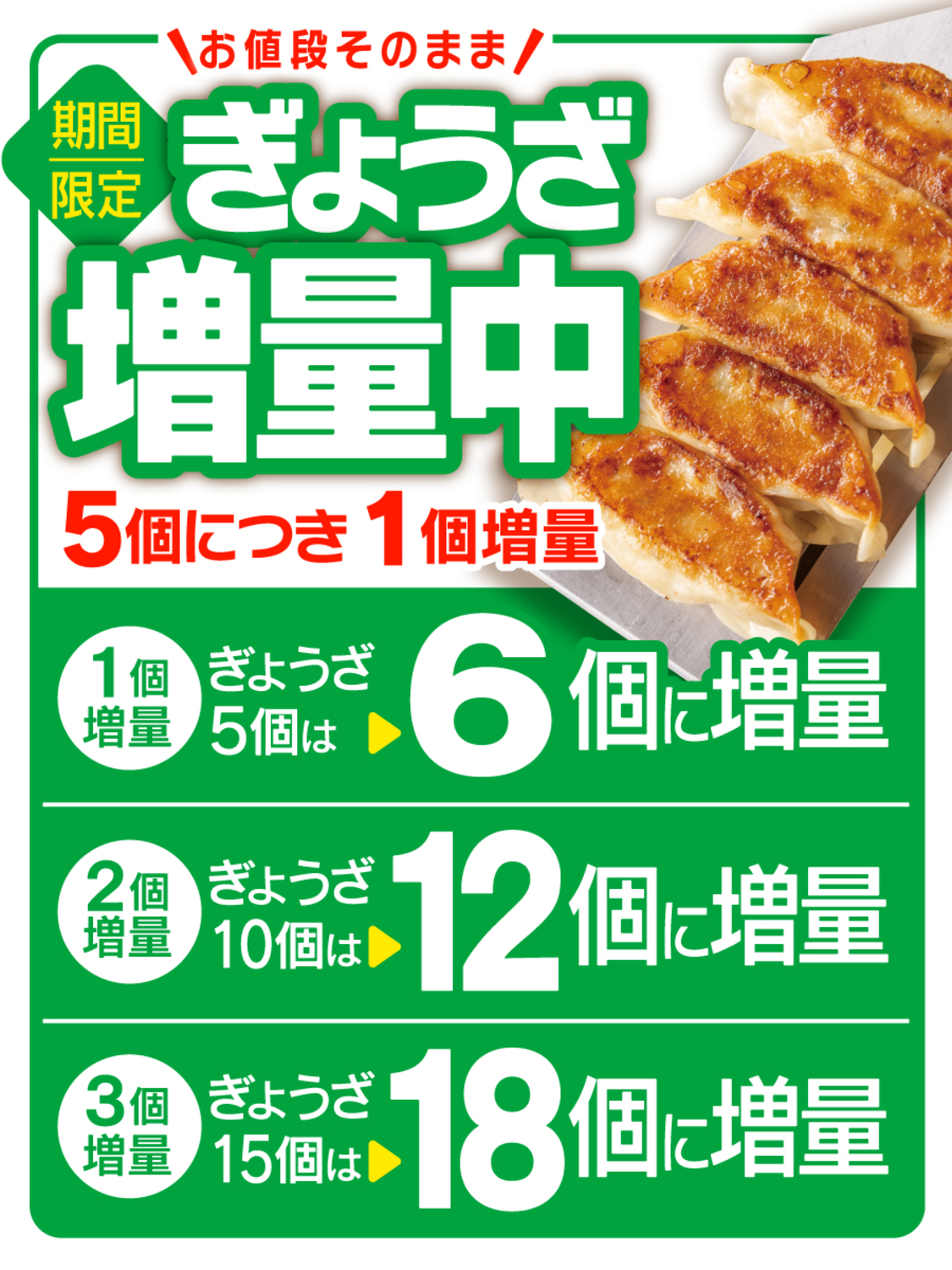 今だけのお得なぎょうざ増量キャンペーンを開催中です。