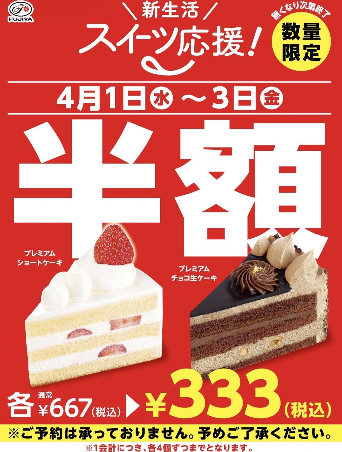 「プレミアムショートケーキ」「プレミアムチョコ生ケーキ」が半額
